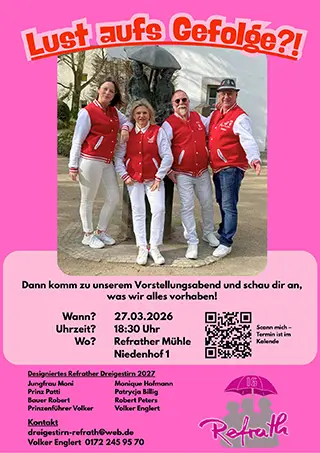 Wir freuen uns, bekanntzugeben, dass das designierte IG Refrather Dreigestirn 2027 nun offiziell vorgestellt wurde!